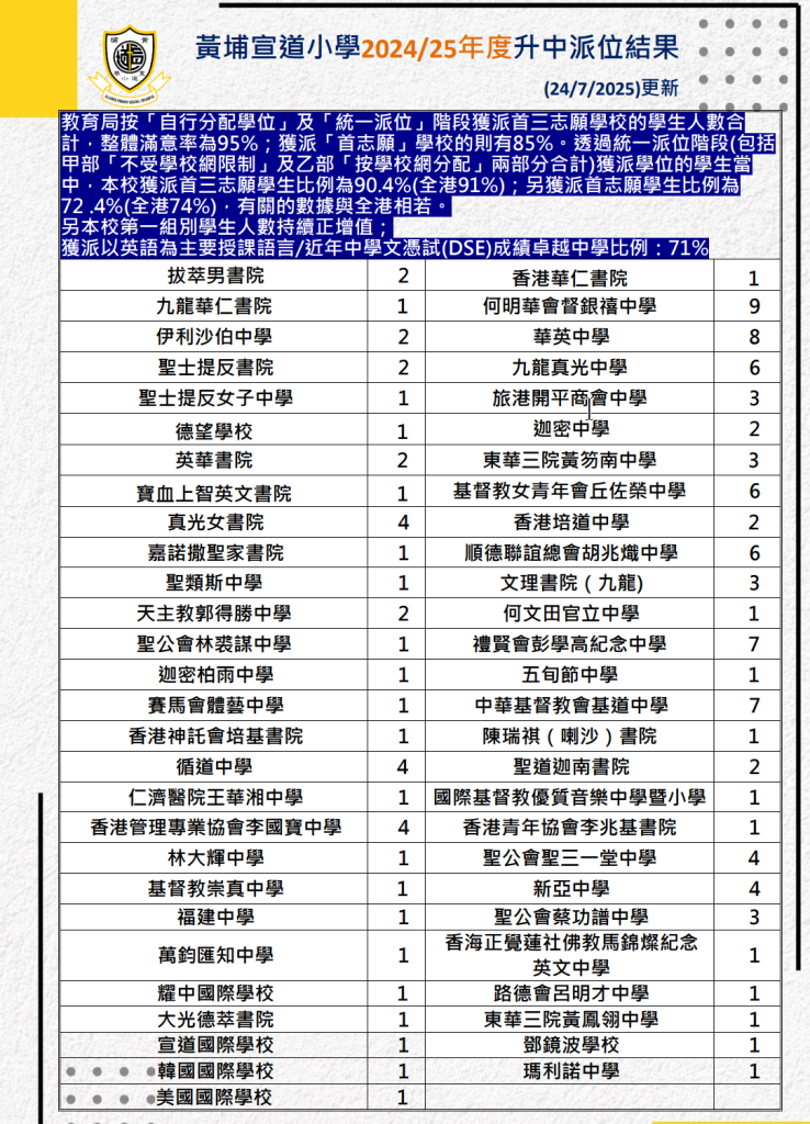 | 德雅中學 | - | - | 1 | 0.7% | - | - | 2A | 170 | 女 | 深水埗 | 英文 |