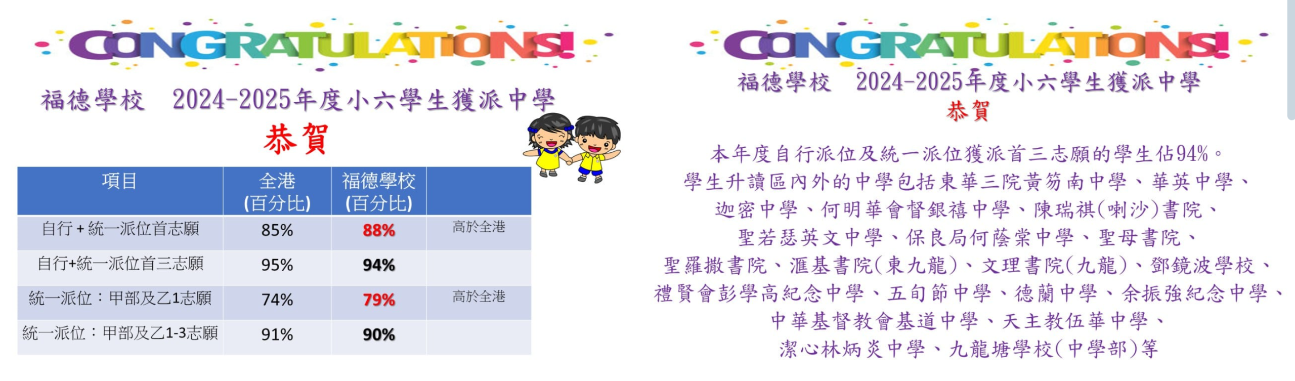 一至三年級平均分配學生入班;四至六年級按考試成績,依學生能力編班。另按需要安排主科「分組合班」以照顧不同學習需要。