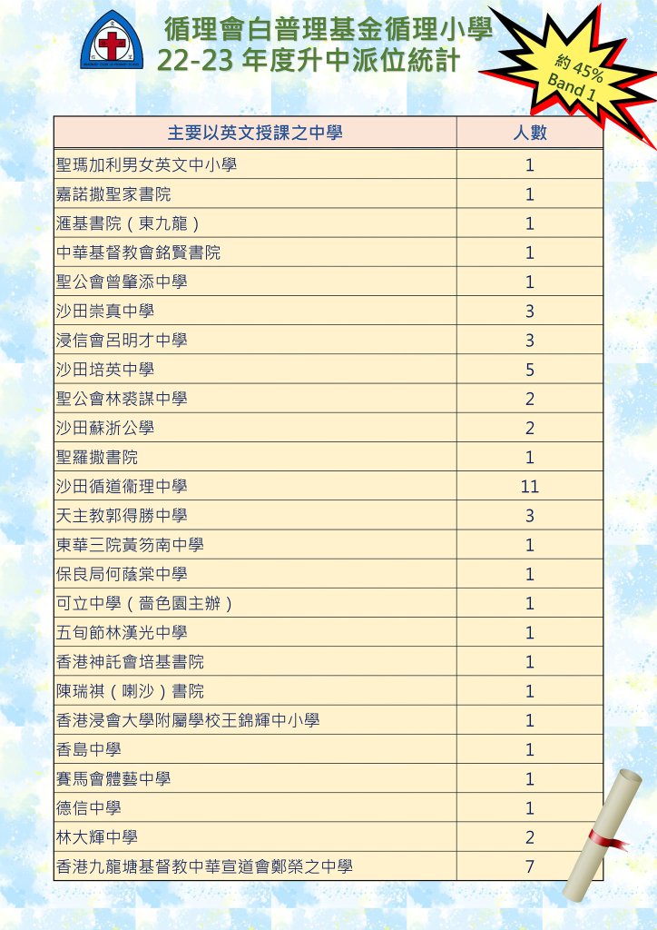 | 中華基督教會銘賢書院 | - | - | - | - | 1 | 0.8% | 1B | 62 | 男女 | 深水埗 | 英文 |