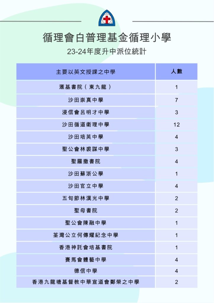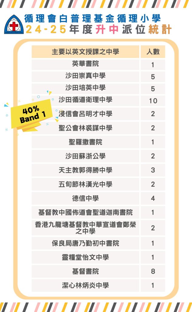 | 沙田培英中學 | 5 | 3.9% | 4 | 3% | 5 | 4.2% | 1A | 43 | 男女 | 沙田 | 英文 |