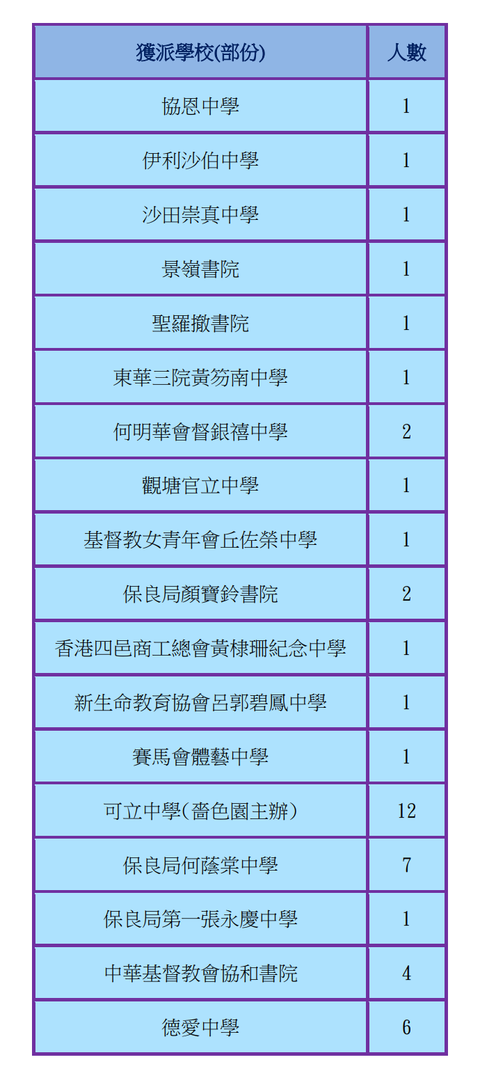 | 協恩中學 HYS | - | - | - | - | 1 | 0.8% | 1A | 4 |