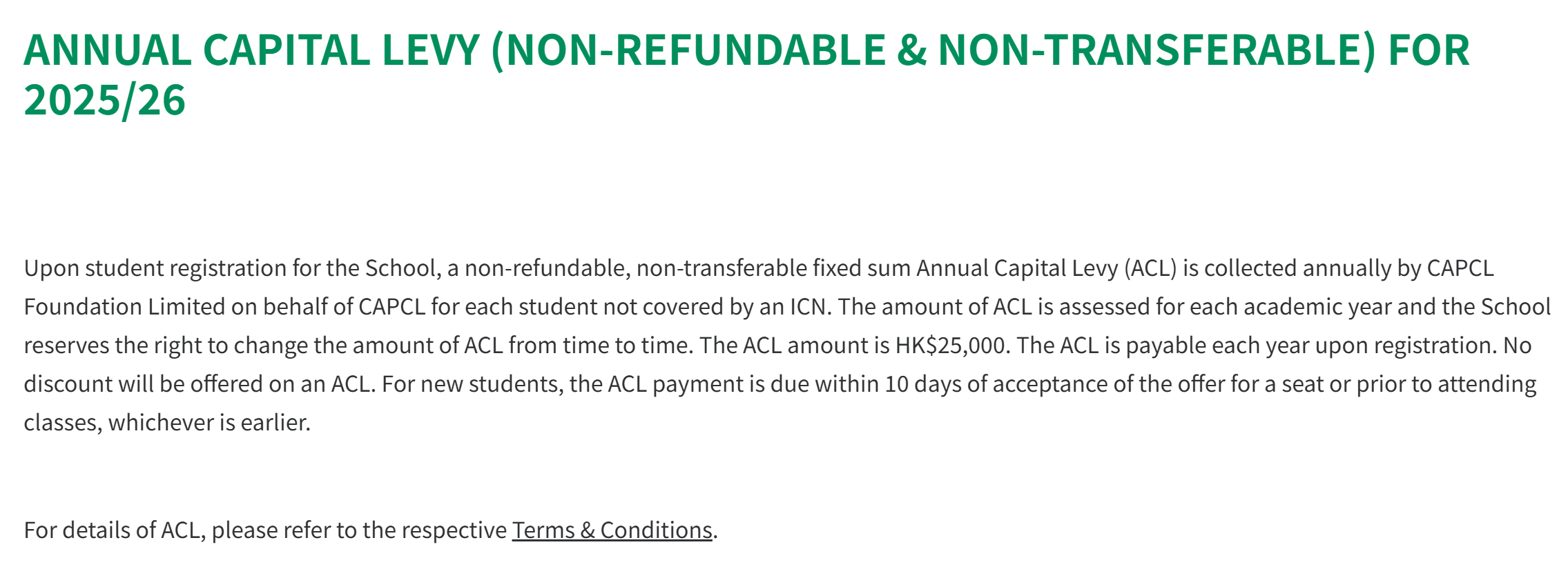 Note: Capital levy in the table is payable annually. Annual expenditure = annual tuition + annual capital levy.