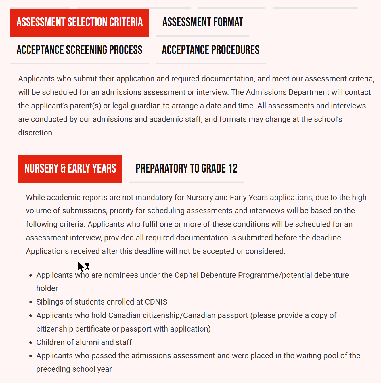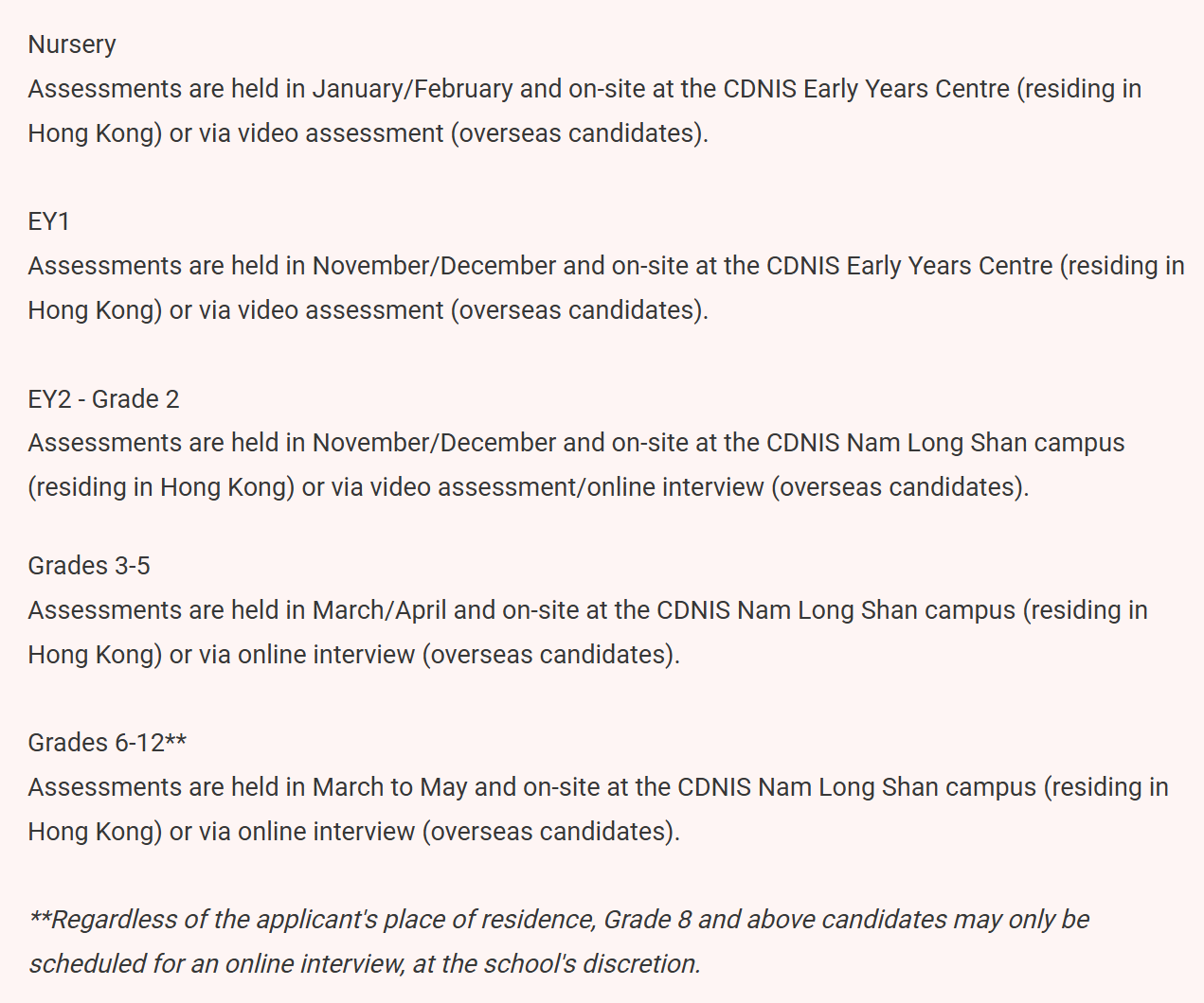 | 1 | Assessment在三月至五月进行,地点在CDNIS Nam Long Shan校区(居住在Hong Kong)或通过在线面试(Overseas候选人)。 |