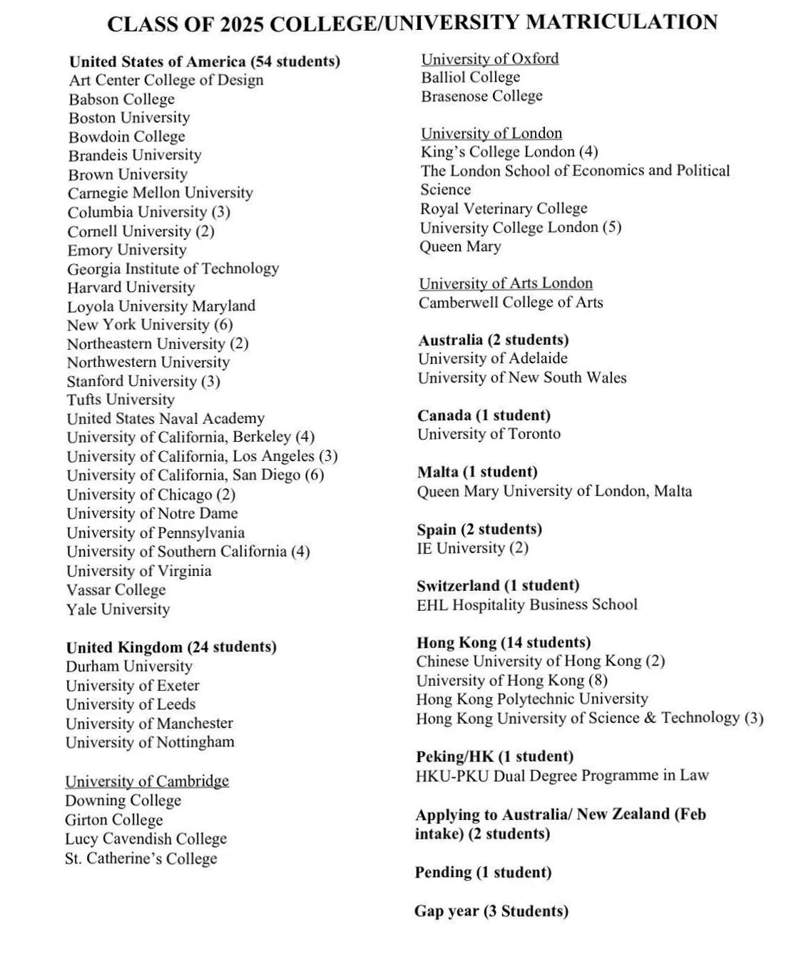 • 优异的升学走向:大学录取排名全港第4,超过50%的学生成功申请美国名校。