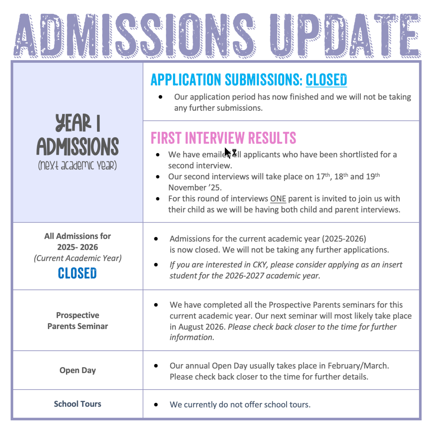 | General Grade | School Grade | Application Start | Application Deadline | Assessment Date | Admission Date |