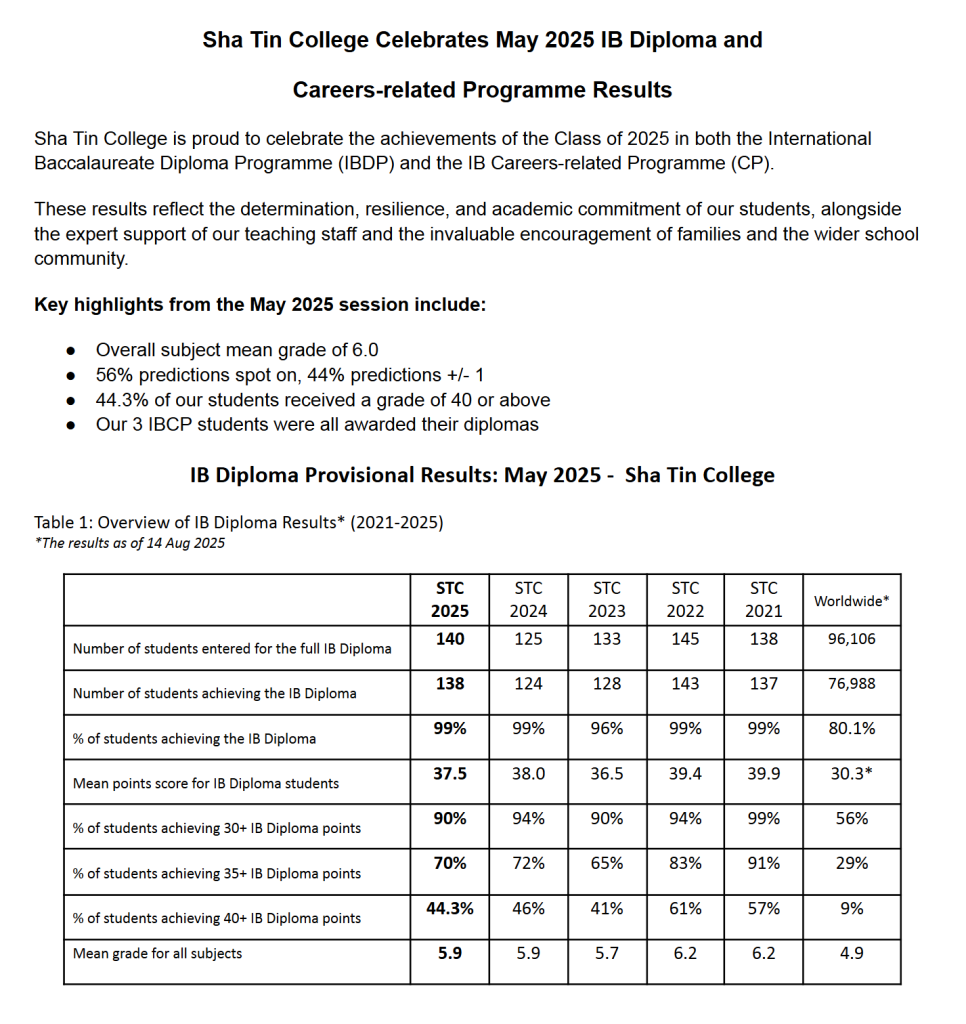 2025年IB均分为37.2分,在英基的7所分校中位居第二,仅次于西岛中学的37.3分,在全港国际学校中位居第11名。