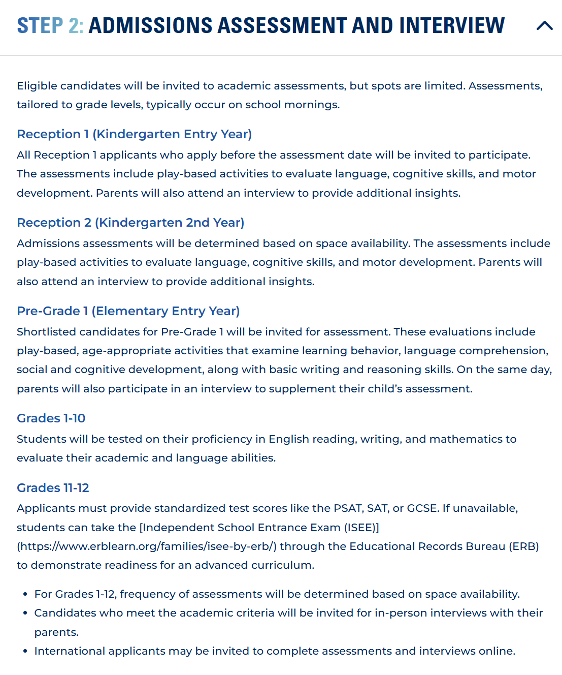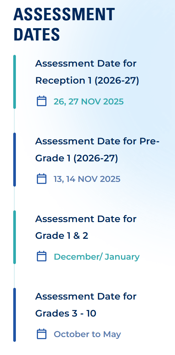 | 3 | 招生评估将根据以下日期进行:11-2月,幼稚园面试;10-5月,其他年级面试(取决于空缺数量安排) |
