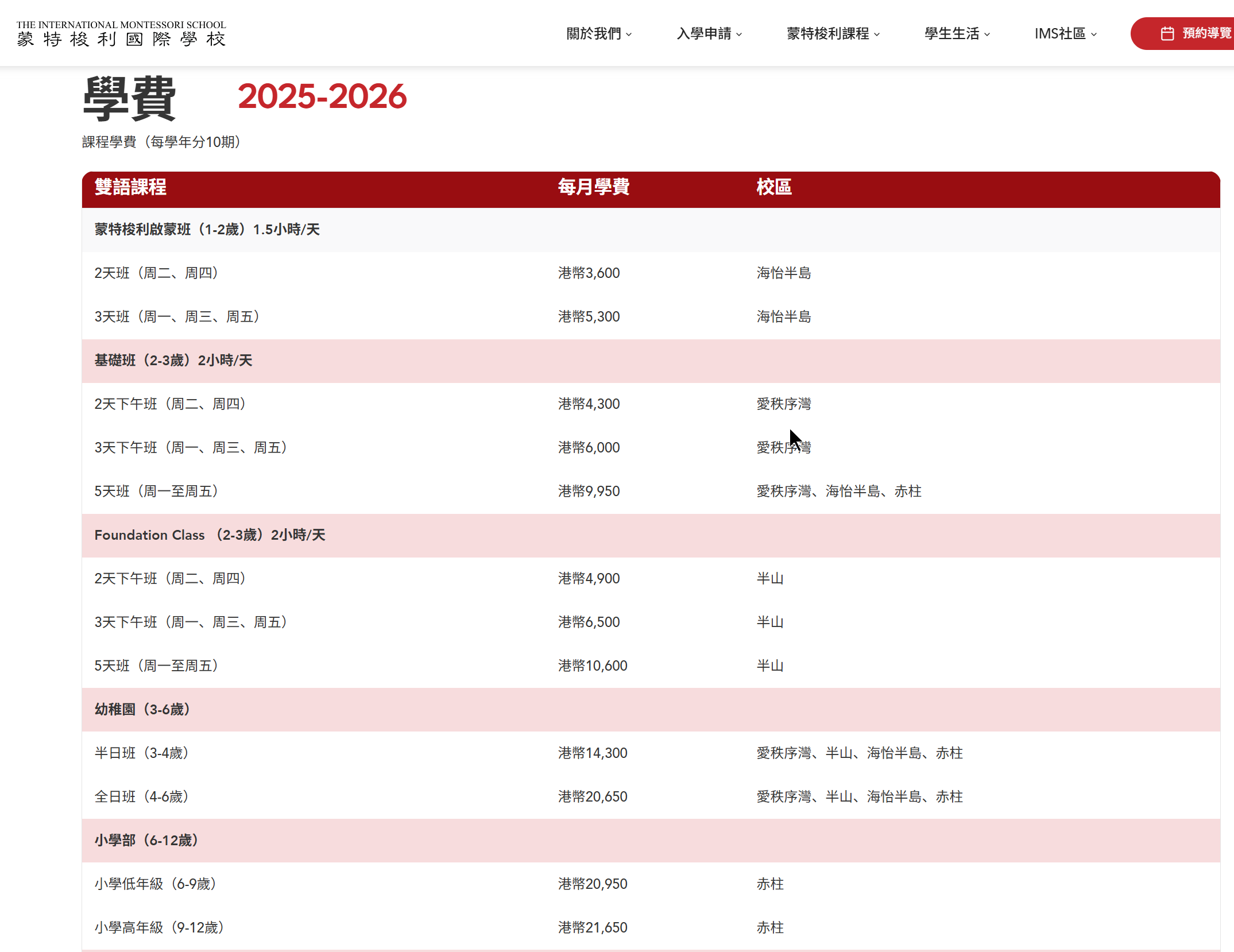 | K1 | Casa dei Bambini | 3 | $206,500 | $35,000 | $241,500 | 幼稚园K1全天班 |
