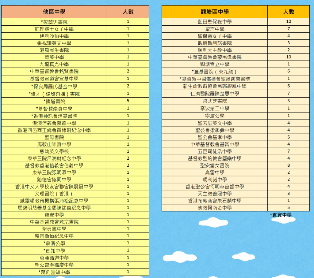 | 聖言中學 | 7 | 4.4% | 7 | 4.9% | 1B | 53 | 男 | 观塘 | 英文 |