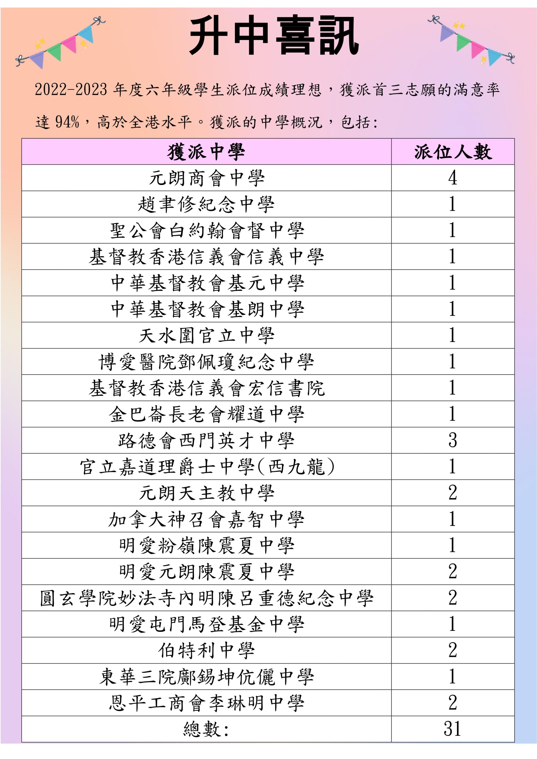 | 中華基督教會基元中學 CCCKYC | 1 | 3.7% | 1 | 4% | 1 | 3.2% | 1C | 71 |