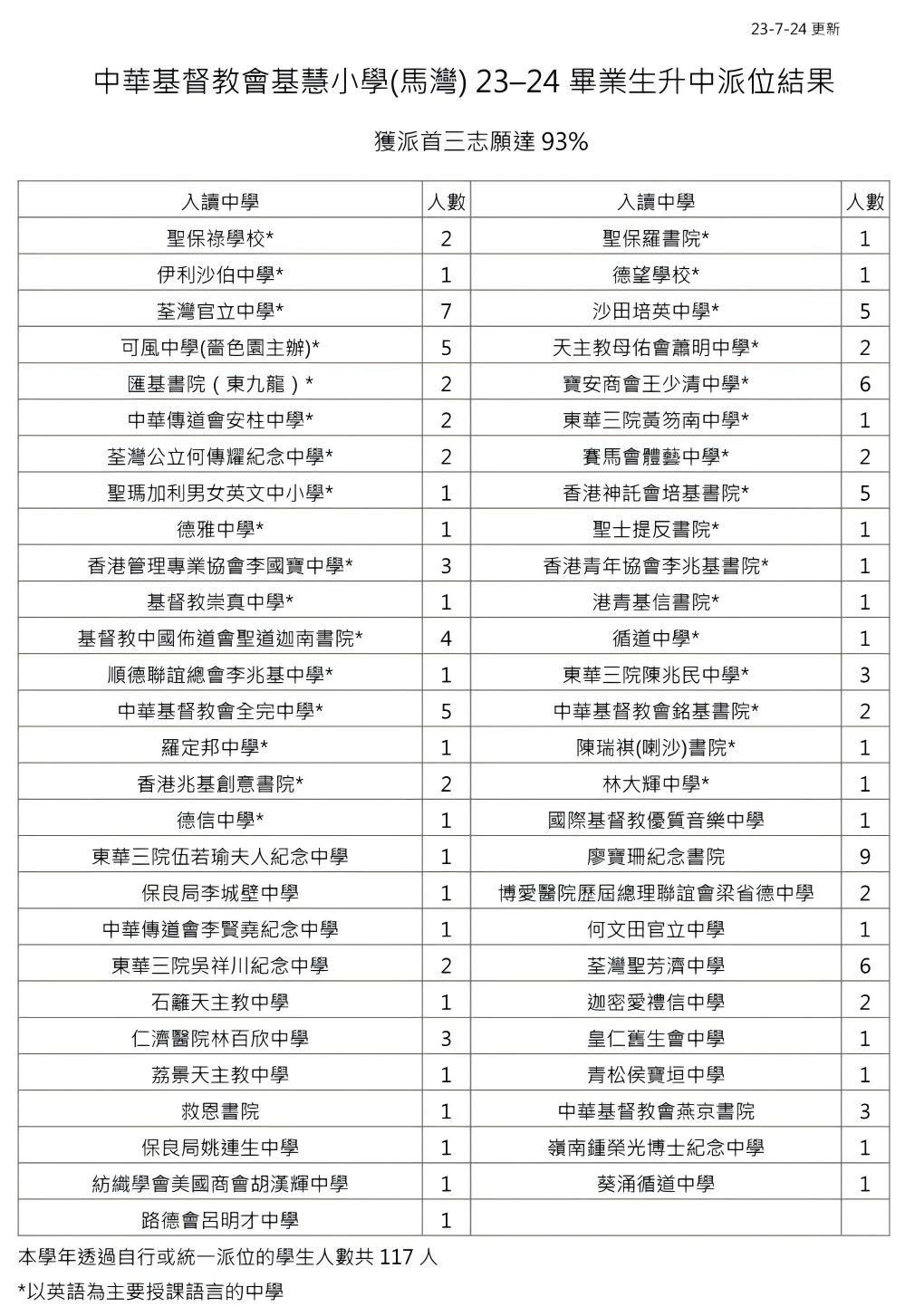 | 中華傳道會安柱中學 CNECCC | 5 | 4.2% | 2 | 1.7% | 2 | 1.5% | 1A | 38 |