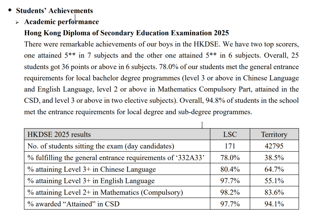 La Salle College has both Policy and a Quality Assurance Management System (QAMS) governing all assessment and reporting. Procedures set out in QAMS monitors the Mid-Year and End of Year exam process and continuous assessment that is used for promotion processes and it also monitors the HKDSE SBA based on the HKEAA and HKDSE regulations.