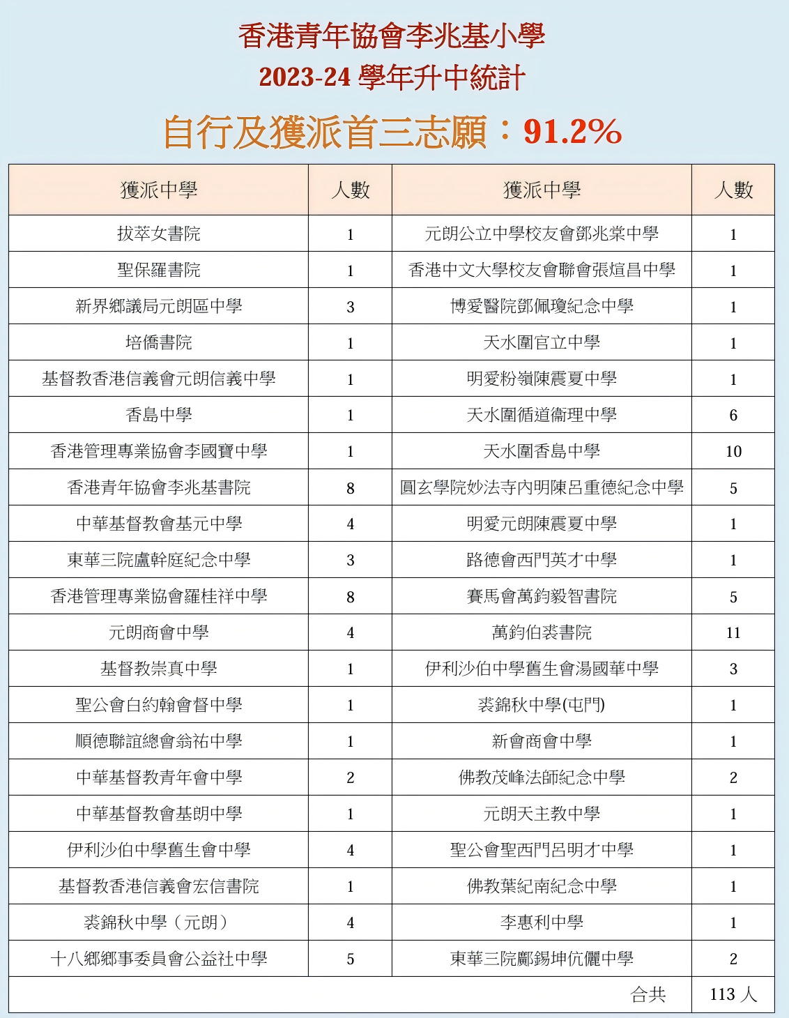 | 元朗公立中學 YLPSS | 1 | 0.9% | - | - | 1 | 0.9% | 1C | 139 |