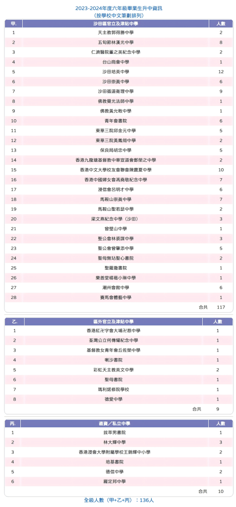 | 沙田培英中學 | 4 | 3.1% | 12 | 8.8% | - | - | 1A | 43 | 男女 | 沙田 | 英文 |
