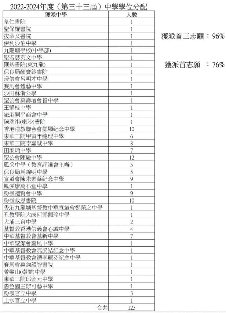 | 優才(楊殷有娣)書院 | - | - | - | - | 1 | 0.8% | 1B | 70 | 男女 | 西贡 | 英文 |