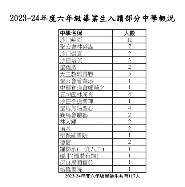 | 培僑書院 | - | - | 1 | 0.9% | - | - | 1A | 17 | 男女 | 沙田 | 英文 |