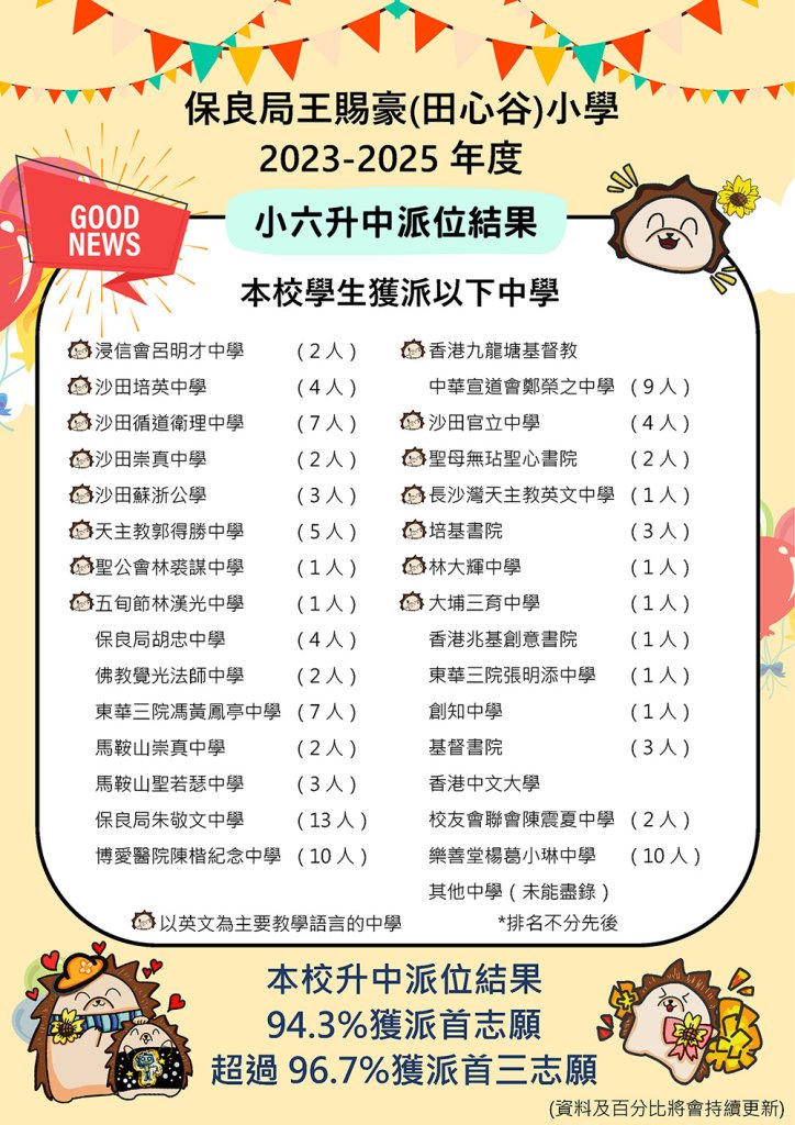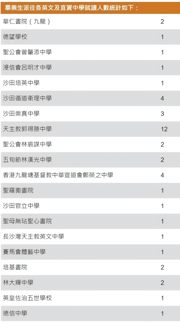 | 聖羅撒書院 | - | - | 1 | 0.9% | - | - | 1B | 97 | 女 | 沙田 | 英文 |