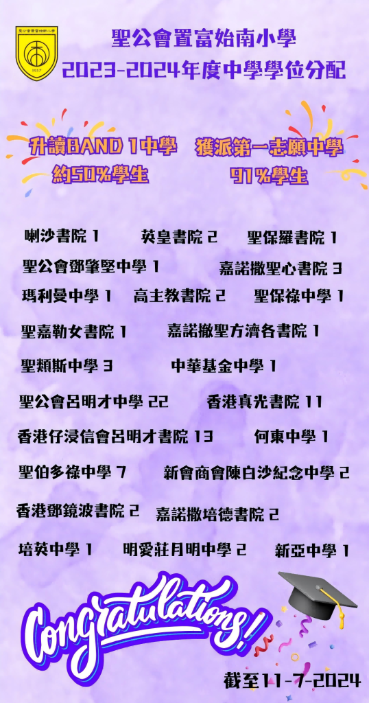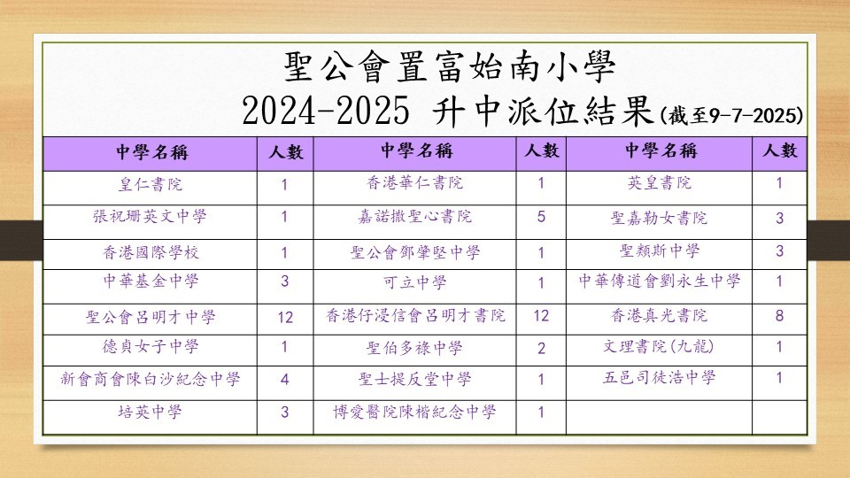 | 聖保祿中學 | - | - | 1 | 1.2% | - | - | 1A | 50 | 女 | 湾仔 | 英文 |
