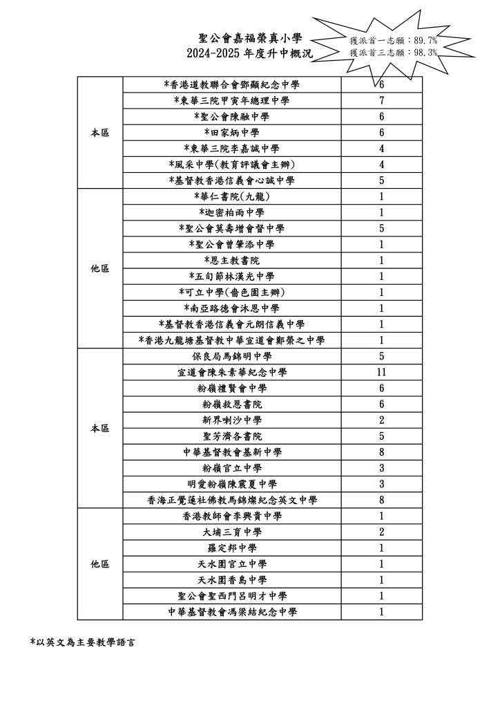| 沙田崇真中學 | - | - | - | - | 2 | 1.7% | 1A | 27 | 男女 | 沙田 | 英文 |