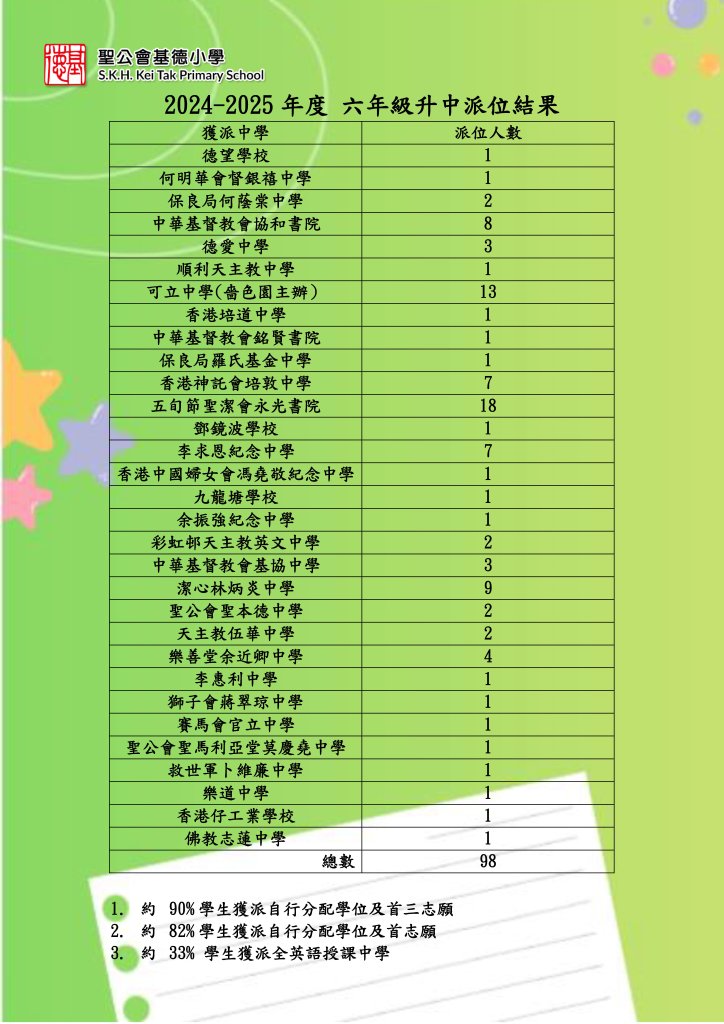 | 德望學校 | 1 | 1% | - | - | - | - | 1A | 9 | 女 | 黄大仙 | 英文 |