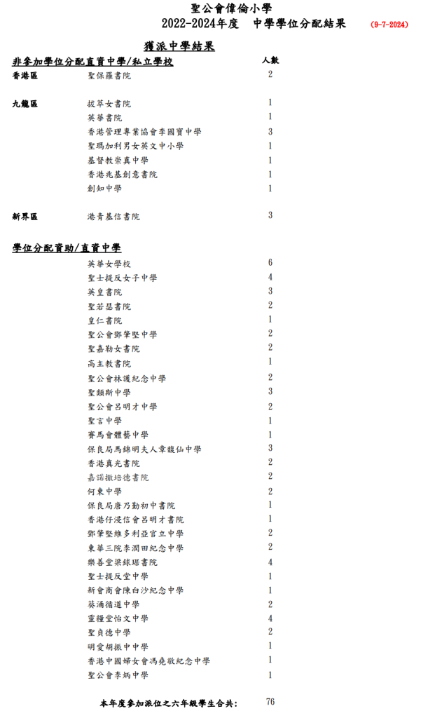 | 拔萃女書院 | - | - | 1 | 1.3% | - | - | 1A | 2 | 女 | 油尖旺 | 英文 |