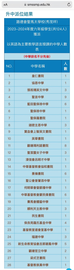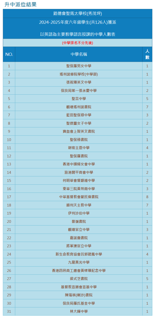 | 聖馬可中學 | - | - | - | - | 2 | 1.6% | 1A | 41 | 男女 | 东区 | 英文 |