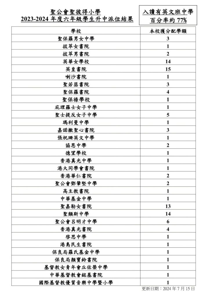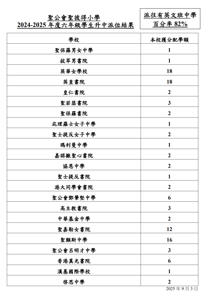 | 拔萃女書院 | - | - | 1 | 0.7% | - | - | 1A | 2 | 女 | 油尖旺 | 英文 |
