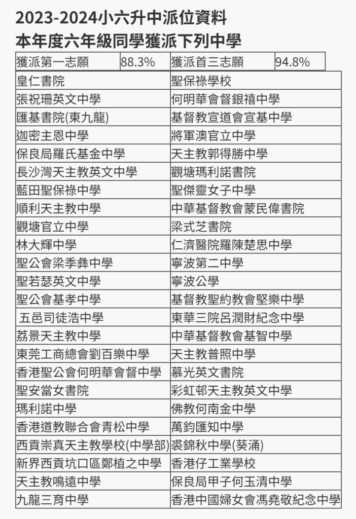 香港本地小学升中率排名(2024)