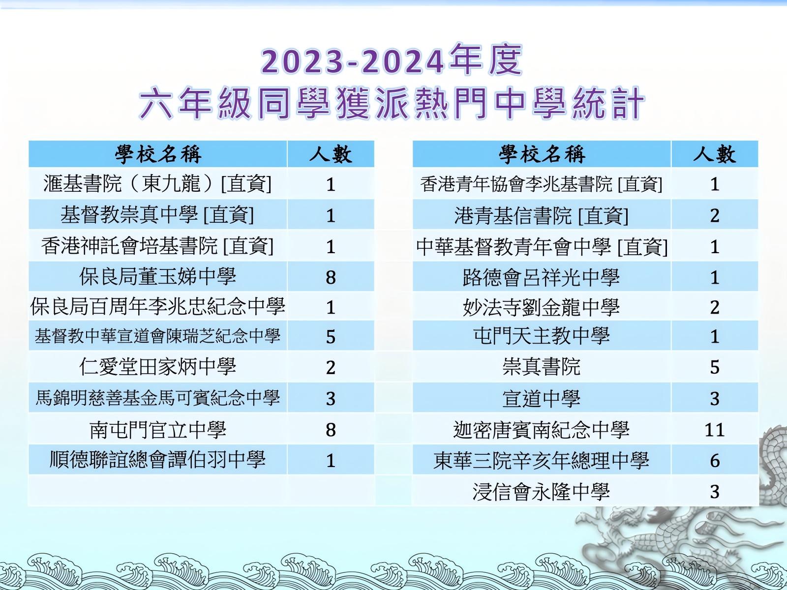 | 保良局百周年李兆忠紀念中學 LSCMC | 2 | 2% | 1 | 1% | 1 | 1% | 1A | 24 |