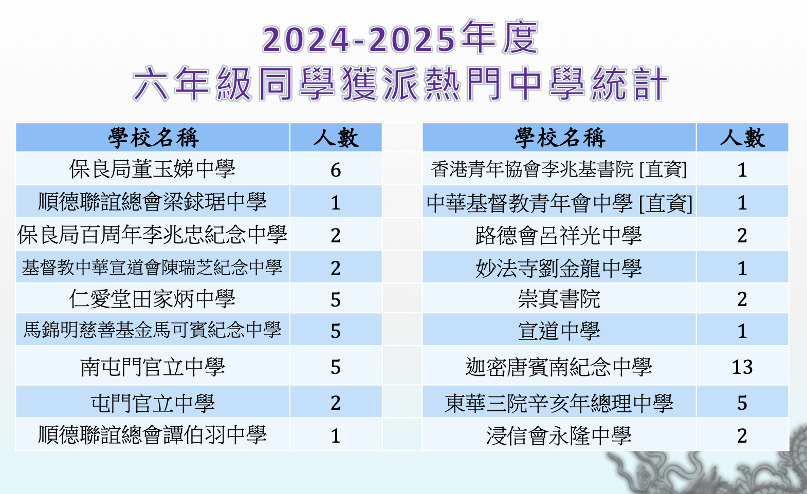 | 妙法寺劉金龍中學 LKL | 1 | 1% | 2 | 2% | 1 | 1% | 1C | 110 |