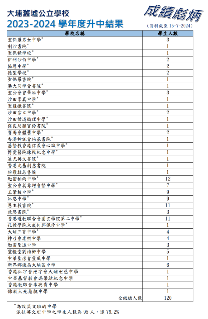 | 大埔三育中學 | 3 | 2.7% | 4 | 3.3% | 6 | 4.7% | 3B | 384 | 男女 | 大埔 | 英文 |
