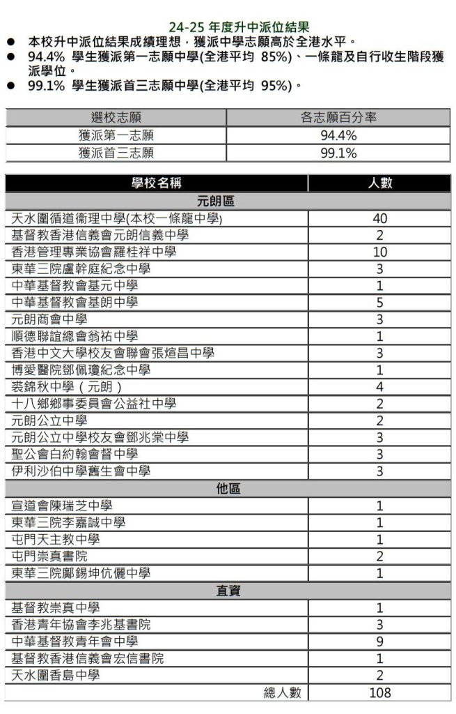 | 聖公會白約翰會督中學 | 3 | 2.8% | 2 | 1.8% | - | - | 1C | 114 | 男女 | 元朗 | 英文 |