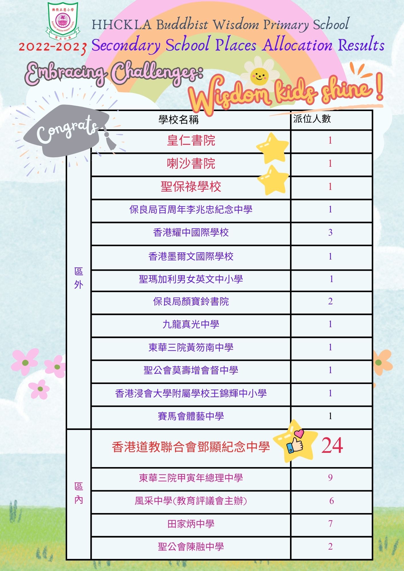 | 中華基督教會銘基書院 CCCMKC | 1 | 0.6% | - | - | - | - | 1B | 51 |