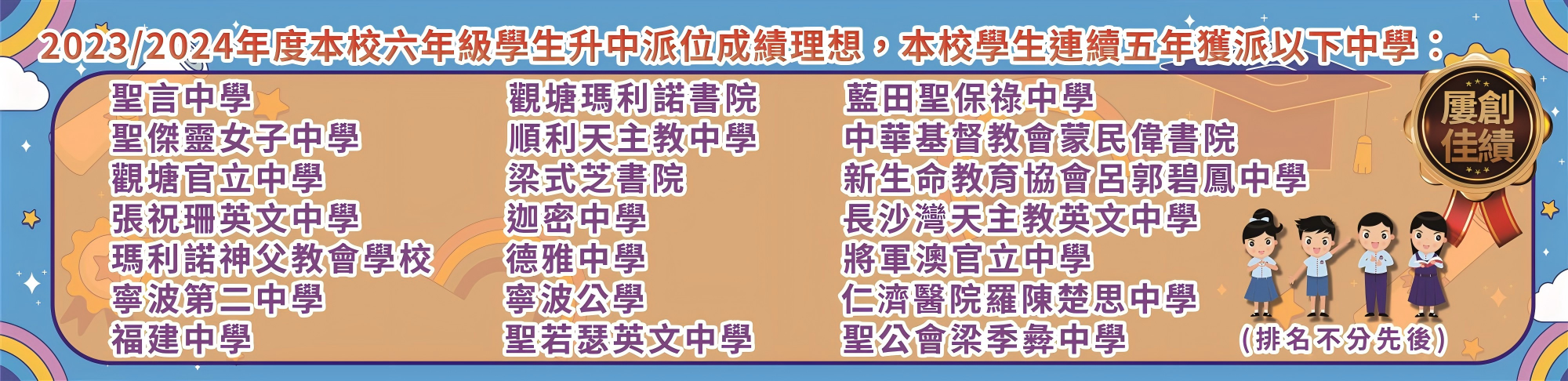 一至三年級混合能力分班;四至六年級按學生能力分班;<br>一至六年級粵教中(四至六年級部分班別普教中)